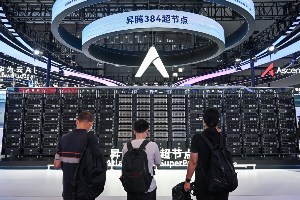 2025年7月26日,上海世博展览馆,华为昇腾超节点技术突破384卡高速互联,通信带宽提升15倍,使千亿级模型性能提升2.5倍以上。澎湃新闻记者 朱伟辉 图